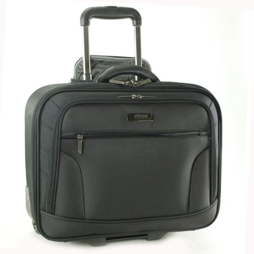 Wheeled overnighter carry-on upright luggage in a stylish and durable 420d polyester exterior. single gusset construction with fully lined interior. easy access front exterior full length zipper pocket. front gusseted zipper pocket includes an organizer for toiletries which features two removable zipper pouches and two open top pockets. main compartment has a full length zippered wet pocket, garment restraints, and two side elastic open top pockets. in-line skate wheeled and locking retractable handle system. sturdy padded top handle allows for easier lifting. rear exterior flip-up flap includes a business card size i.d. Tag. size: 16.75 inch w x 12.75 inch h x 5.5 inch d